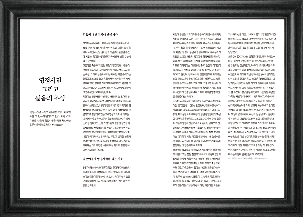 또 다른 사례로 지난 2018년 여름에는 3명으로 이루어진 팀 ‘김김박’의 <27살 김유진씨, 영정사진 찾아가세요>라는 이름의 프로젝트 형태의 전시가 열리기도 했다. 대학생들로 이루어진 이 팀은 청년들에게 ‘죽음’에 대한 질문을 던졌다. 그리고 참가자들이 이에 답한 뒤 그들의 영정사진을 기록으로 남기는 방식으로 진행되었다. 이 프로젝트에서 인상적인 것은 타인이 아닌 참여자들이 자기 자신의 영정사진을 직접 촬영한다는 것이었다. 이런 과정은 촬영에 참가한 젊은이들로 하여금 자기 자신의 내면을 들여다보는 기회를 제공한다는 데 방점이 찍혀 있었다.