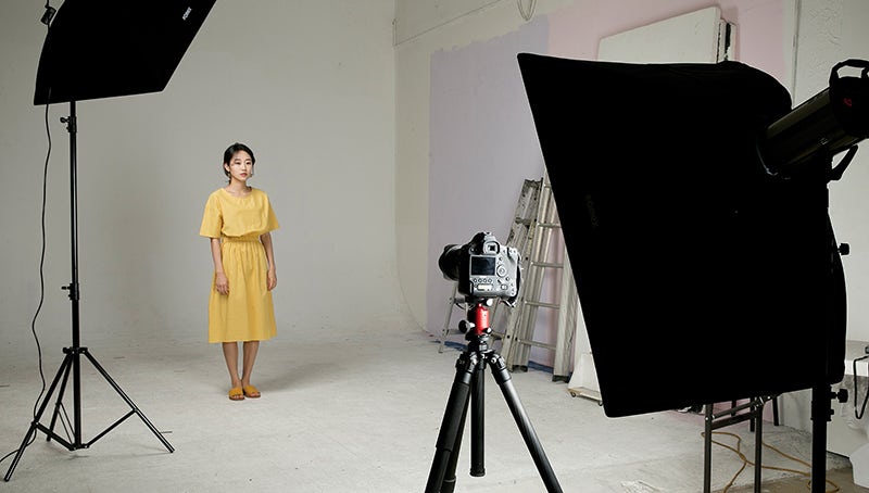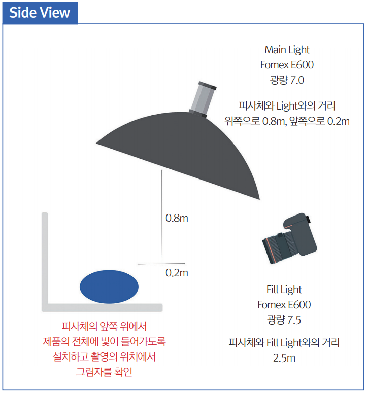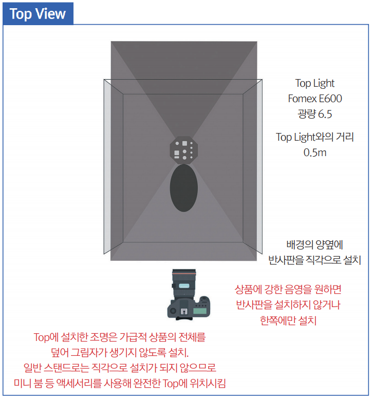 패션 잡화인 경우 제품의 표면 재질에 따라서 조명법을 달리한다. 신발의 경우 제품에 따라 유광, 반광, 무광이 있으며, 그중에서 무광인 운동화를 샘플로 정해촬영한다. 오프라인 매장에서 신발을 구매한다고 상상하고 판매 페이지에서 필요한 컷을 생각한다. 매장에서는 제품을 만지고 신어볼 수 있지만, 온라인에서는 불가능하므로 가급적 많은 정보를 사진으로 전달해야 한다. 신발은 부피가 크지 않고 무광이므로 한 개의 조명을 사용하고, 상황에 따라 반사판을 더하는 것이 효과적이다. 예시 사진은 모두 한 가지 조명법으로 촬영된 것이다. 스튜디오 촬영을 하는 경우 절대 촬영자와 조명의 위치가 바뀌지 않는다. 다른 방향의 사진을 원한다면 제품의 방향을 바꿔가면서 촬영한다. 또한 마크로렌즈를 이용해 다가가서 상세 컷을 촬영하는 경우 밝기와 색상에 변화가 생길 수 있으므로, 그레이카드를 사용해 노출과 색상을 다시 세팅하는 것이 좋다. 예시에서처럼 탑에서 조명을 사용하면 별도의 반사판이 필요하지 않다. 만약 조명이 들어가는 가운데 부분과 양 옆에 밝기 차이가 있다면, 신발의 양 옆에 우드락으로 반사판을 만들어 사용하면 된다.