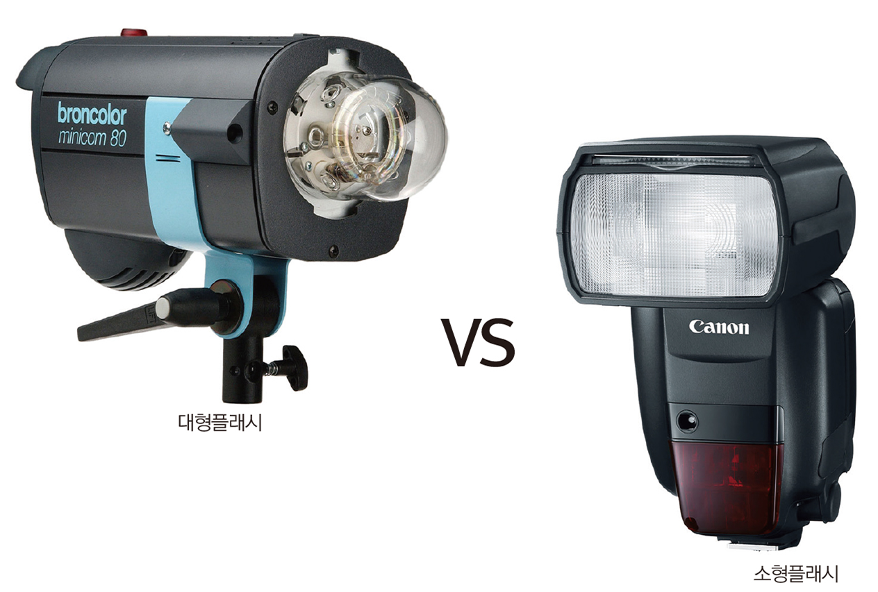 보통 스튜디오에서 사용하는 플래시는 ‘대형’으로, 카메라에 장착하는 플래시는 ‘소형’으로 분류한다. ‘대형 플래시’는 정밀한 조명 컨트롤과 우수한 품질의 이미지를 얻는 데 포커스가 맞추어져 있다. 상대적으로 광량이 강하고 많은 전력을 필요로 한다. 빛을 확산시키거나 모으는 등의 역할을 하는 다양한 액세서리들을 플래시에 장착해서 사용할 수 있다. 또한 모델링램프가 장착되어 촬영하기 전부터 조명이 만들어내는 명암을 미리 살펴볼 수 있다. 반면 ‘소형 플래시’는 기동성에 포커스가 맞추어져 있다. 일상용으로는 충분한 광량을 표현하고, 전력도 AA건전지 네 개면 충분하다. 카메라에 장착한 상태에서 제한적으로 각도 조절을 빠르게 할 수 있으며, TTL과 고속동조 등 신속한 촬영과 관련해 다양한 편의기능을 제공한다.