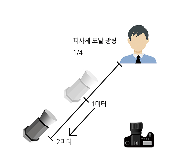 역제곱의 법칙을 알아두면 이런 상황에 요긴하게 써먹을 수 있다. ‘빛의 밝기는 거리의 제곱에 반비례한다’는 내용이다. 이에 따르면 조명이 2배 멀어지면 4배 어두워지고, 3배 멀어지면 9배 어두워진다. 이를 알면 플래시를 이용한 촬영에서도 조명과 피사체 간의 거리변화에 따라 달라지는 세팅 값을 쉽게 변경할 수 있다. 예를 들어, 1m 거리에서 플래시를 사용하다가 2m로 멀어지면 플래시의 광량은 1/4로 줄어들고 그 결과 사진은 2스톱 어두워진다. 그럼 조리개를 2스톱 열거나, 감도를 2스톱 높이거나, 광량을 4배 강하게 해야 이전과 동일한 노출을 얻을 수 있다.