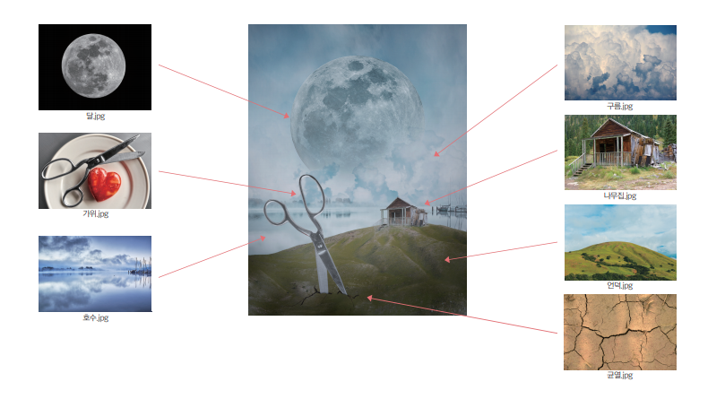 사전에 준비해야 할 것은 ‘아이디어 스케치’와 ‘이미지 소스 준비’ 정도가 있겠다. 우선 머릿속에 어떤 이미지 를 만들지 떠올려본다. 앞에서 설명한 데페이즈망을 기 반으로 사물을 낯설게 만드는 상상을 해본다. 그리고 이 를 스케치로 옮긴다. 이후 이미지 합성에 필요한 소스 를 준비한다. 직접 촬영하면 좋지만, 여건이 되지 않는 다면 스톡 사이트에서 구해도 무방하다. 참고로 예제 사 진에 사용한 소스는 모두 무료 이미지 사이트인 언스플 래시(unsplash.com)와 픽사베이(pixabay)에서 다운받 았다. 소스를 찾을 때 주의해야 할 점은 ‘해상도’와 ‘앵 글’ 그리고 ‘초점거리’다. 해상도가 작으면 결과물의 특 정 부분이 흐려 보일 수 있다. 최소 긴 변 2500px 이상 의 소스를 추천한다. 만약 하이앵글로 스케치했다면 소스 역시 하이앵글로 선택해야 한다. 아이레벨이 기준이 라면 아이레벨 소스를 찾는 게 좋다. 초점거리는 원근감 을 이유로 최대한 유사한 소스들로 구성하는 게 유리하 다. 망원렌즈로 촬영한 이미지는 원근감을 압축하고, 광 각렌즈로 촬영한 이미지는 원근감을 과장시킨다. 뿐만 아니라 이 둘은 주변부 왜곡의 특성도 완전히 다르다. 결국 각 소스들이 하나의 이미지 안에서 자연스럽게 어우 수 있는 지를 상상해보는 게 포인트다.
