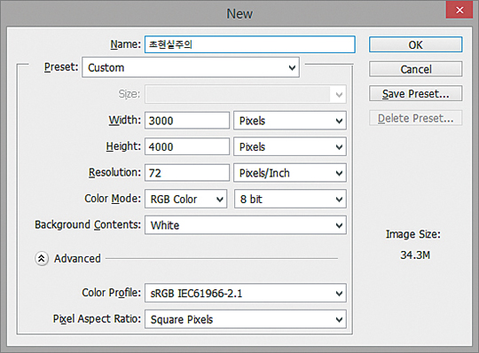 사진작업 위주로 포토샵을 다뤄온 사람이라면 새 도큐먼트 만들기부터 익숙하지 않을 수 있다. 먼저 상단 메뉴바의 [File]→[New]를 클릭한다. 이후 원하는 최종 결과물에 맞는 세팅값을 입력한다. 예제사진의 경우 가로(Width) 3000픽셀, 세로(Height) 4000픽셀을 설정했다(에디터가 개인적으로 선호하는 세로 사진의 비율은 3 : 4다). 픽셀수를 높게 세팅할수록 각각의 소스 이미지의 해상도 역시 커야 하기 때문에 이를 잘 고려한 후 도큐먼트 사이즈를 정한다. 해상도(Resolution)는 추후 재수정 할 수 있으므로 큰 의미가 없다. 예제사진은 기본 값 72ppi로 설정했다. 컬러모드(Color Mode)는 RGB 8비트로 설정한다. Raw파일을 작업할 때는 16비트가 원칙이지만, Jpg를 불러와 작업하는 경우에는 용량만 커지고 큰 의미가 없다. 색공간(Color Profile)은 sRGB IEC61966-2.1로 세팅한다.