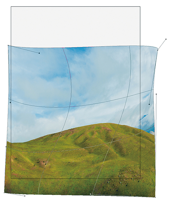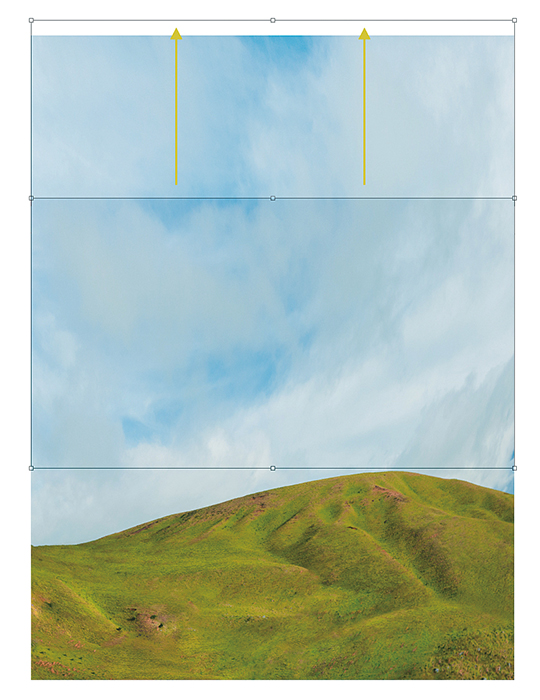 비어 있는 도큐먼트 상단 공간을 메울 차례다. 작업은 비교적 간단하다. 우선 레이어 패널에서 언덕 스마트오브젝트를 선택한다. 렉탱글 마퀴 툴( )을 클릭하고 언덕의 윗부분 하늘만을 드래그 해서 선택영역으로 지정한다. 이어 [Ctrl]+[J]를 누른다. 그럼 선택영역에 해당하는 부분만 새 레이어로 복사된다. 복사된 레이어를 선택한 채 상단 메뉴바의 [Edit]→[Free Transform]를 클릭하여 자유변형 도구를 실행한다. 그리고 상단 꼭지점을 잡아 위쪽으로 드래그해 도큐먼트 상단의 빈 공간을 하늘로 채운다. 이쯤에서 레이어 정리도 하면 좋겠다. 스마트오브젝트는 ‘언덕’, 복사한 하늘 레이어는 ‘언덕 하늘’로 이름을 변경한 다음, 두 레이어를 ‘언덕’이라는 이름의 그룹으로 만든다.