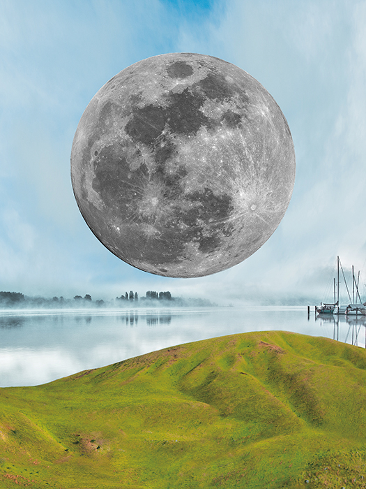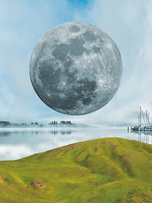 컬러 보정으로 분위기를 한층 업그레이드시킬 차례다. 자세한 수정항목은 다음과 같다. 1 Vibrance 조정 레이어를 만들어 이미지 전체의 채도를 낮춘다. 이미지의 색감을 서늘하게 만들기 위해 Photo Filter 레이어를 이용해서 푸른색을 가미한다. 2 서늘한 이미지 느낌 대비 언덕의 초록색이 너무 싱싱한 느낌이다. Hue/Saturation 레이어를 만들어 Hue값을 좌측으로 이동시킴으로써 약간 노란색 빛이 돌게 하고, 동시에 채도(Saturation)를 낮춘다. 물론 마스크를 이용해 해당 부분만 보정 값이 적용되도록 만들어야 한다. 3 짙은 파란색 Photo Filter 레이어를 만들어 하늘의 색감이 풍부해 보이도록 만든다. 4 시안(Cyan)에 가까운 파란색 Photo Filter 레이어를 만들어 무채색에 가깝게 표현된 달의 하단부에 색감을 가미한다. 5 하늘에서 유독 강렬한 색감을 가진 부분의 채도를 Hue/Saturation 레이어를 활용해서 낮추고 작업을 마무리한다.