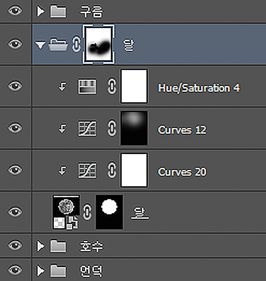 작업을 진행하다 보니 구름과 달이 겹쳐 보인다. 이를 보다 더 자연스럽게 만들기 위해 달 스마트오브젝트의 마스크작업을 보완하는 과정이 필요하다. 이미 만들어진 마스크에 검은색 브러시를 덧칠하는 방법도 있지만, 그렇게 작업할 경우 추후 재수정할 때 달의 둥근 모양을 유지하기가 힘들다. 따라서 달 스마트오브젝트와 조정 레이어들을 하나의 그룹으로 만든 다음 이에 마스크를 적용하는 프로세스로 진행한다. [Ctrl] 버튼을 누른 채 해당 레이어들을 하나씩 클릭함으로써 모두 선택한 다음 [Ctrl]+[G]를 누른다. 그럼 하나의 그룹으로 만들어진다. 이후 레이어 패널 하단의 마스크 만들기( )를 클릭한다. 그러면 그룹에 레이어마스크가 생긴다. 이것을 선택하고 달과 구름이 겹쳐진 부분들을 검은색 브러시로 터치해서 자연스러워 보이도록 만든다.