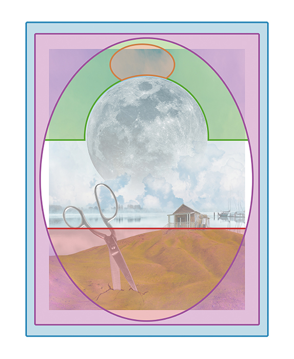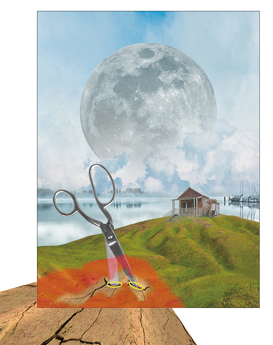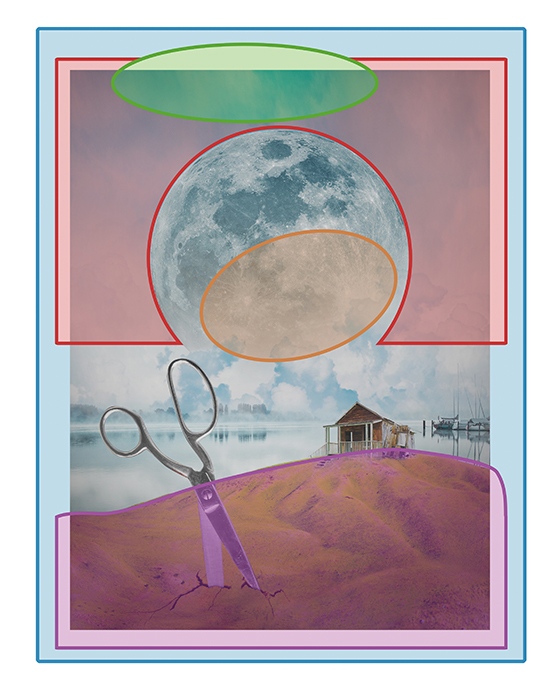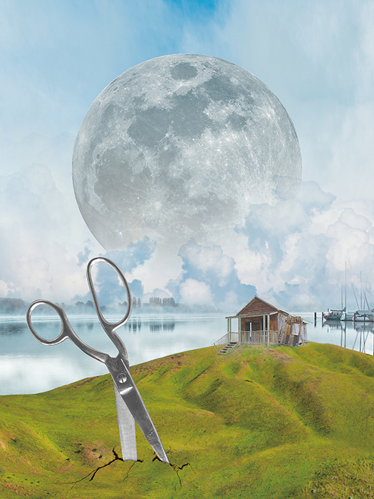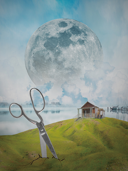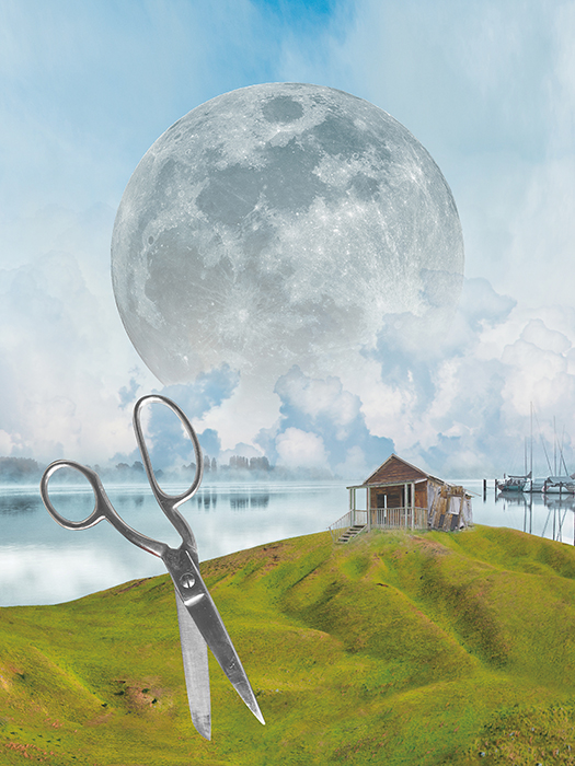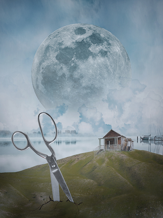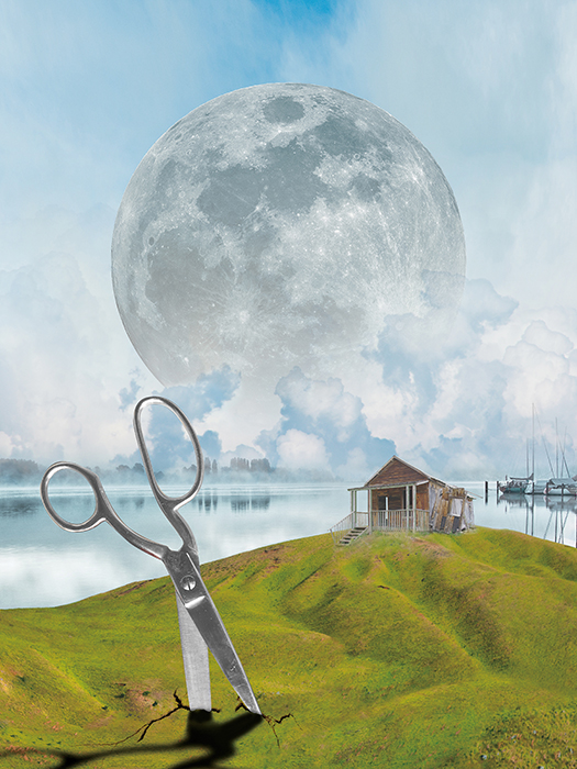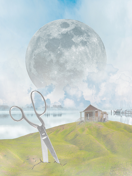‘집.jpg’와 ‘가위.jpg’를 불러와서 합성할 차례다. 이 소스 이미지들은 자유곡선 형태를 띠는 데다 복잡한 조형 구조를 가지고 있다. 게다가 반드시 선명하게 보여야 하는 주요 오브제들이다. 따라서 펜 툴( )을 사용해 누끼 작업을 하는 게 효과적이다. 두 이미지들을 적절한 위치에 배치하고 펜 툴( )을 클릭한다. 상단 옵션바 Shape가 기본 값으로 되어 있는 선택항목을 Path(Mask)로 변경한다. 먼저 나무집 외각 패스를 그린 후 선택 영역으로 변환한다. 이제 나무집 스마트오브젝트를 선택하고 레이어 패널 하단의 마스크 생성( )을 클릭하면 배경이 자동으로 사라진다. 만약 배경이 아니라 나무집이 사라진다면 레이어마스크를 선택하고 [Ctrl]+[I] 키를 누르면 된다. 나무집 안쪽의 지워야 할 부분도 동일한 방법으로 선택영역을 지정하고 레이어마스크를 검정색 (#000000)으로 칠해 없앤다. 가위 역시 이와 같은 과정을 거친다. 이후 나무집 하단이 언덕과 자연스럽게 이어지도록 Hardness가 낮은 검정색 브러시를 이용해 살짝 터치하고, 보기 싫은 부분들을 제거한 후 톤과 색을 조정한다.