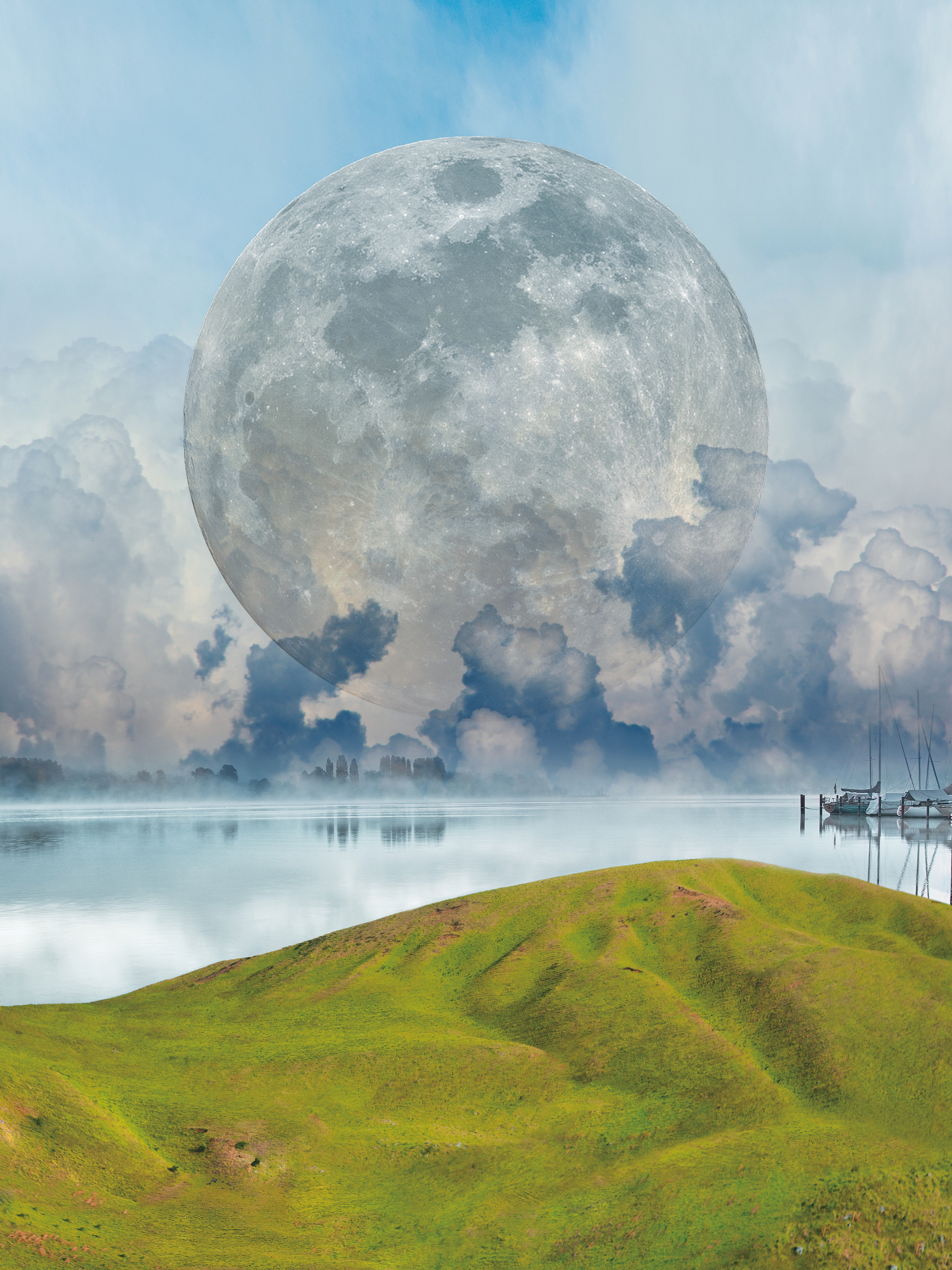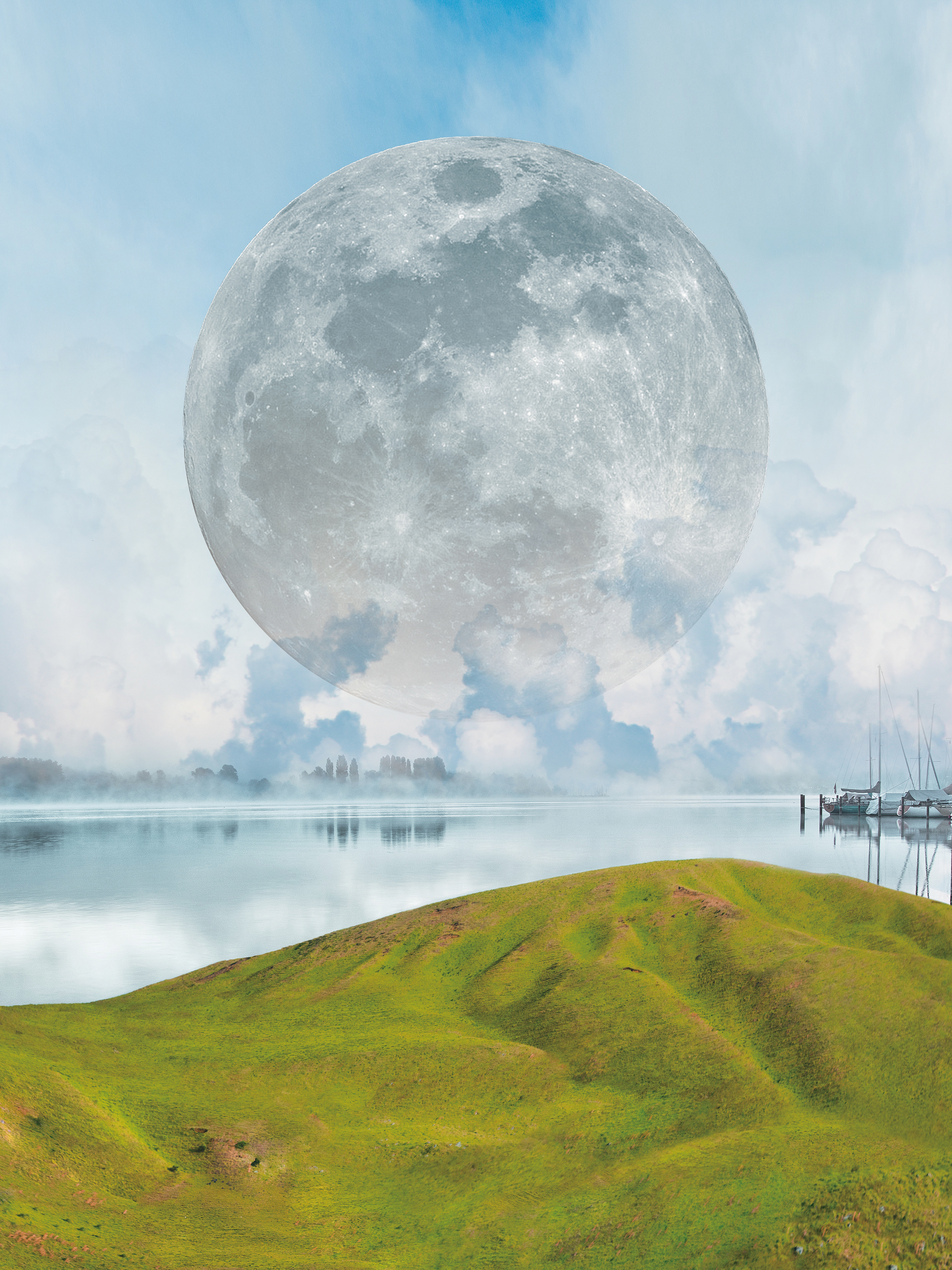 이제부터 호수 합성과 유사한 작업을 반복한다. 상단 메뉴바의 [File]→[Place(Place Embedded)]를 클릭해 ‘달.jpg’를 도큐먼트에 불러들인다. 원 소스의 달 모양은 완전히 둥근 형태를 띤다. 따라서 누끼작업을 위해 가장 쉬운 방법인 일립티컬 마퀴 툴( )을 사용한다. 툴을 선택하고 달 모양을 따라 원을 그림으로써 선택영역을 지정한다. 이제 달 스마트오브젝트를 선택하고 레이어 패널 하단의 마스크 만들기( )를 클릭한다. 그러면 자동으로 달만 남고 배경은 투명하게 처리된다. 이후 부자연스러운 부분들은 Hardness 값을 높게 세팅한 브러시를 이용해서 레이어마스크를 터치한다. 자유변형 도구를 이용해 위치 및 크기를 잡고, 호수와 마찬가지로 톤과 색이 잘 어우러지게끔 보정한다. 커브 레이어를 이용해 미드 톤의 밝기를 낮추고, 또 다른 커브 레이어로 달 상단부를 밝게 만든다. 이어 휴/세츄레이션 레이어를 만들어 Colorize를 체크하고 Hue 값을 193 Saturation 값을 15로 세팅해서 푸른빛이 돌게 만든다. 물론 이 조정 레이어들은 달 스마트오브젝트에만 적용되도록 클리핑 마스크를 적용해야 한다